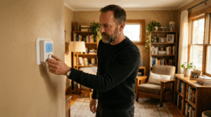 man in his forties buttons up a shirt